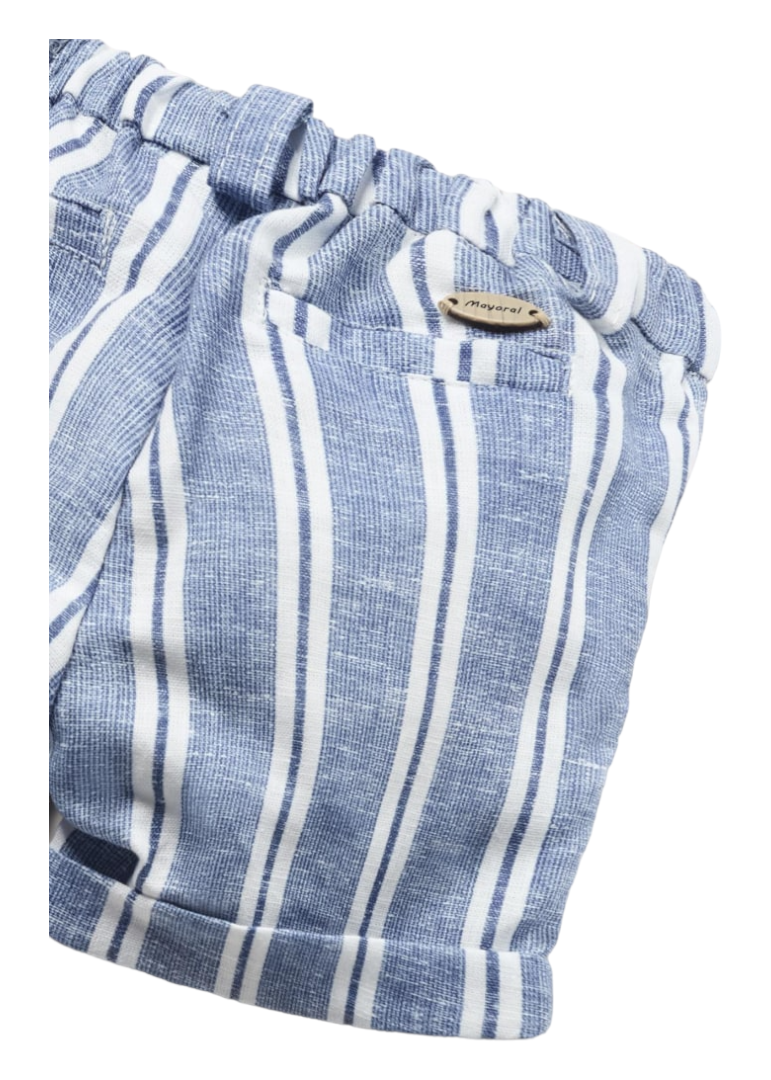 Pantalón de tipo bermuda para recién nacido. Cintura con goma elástica y cierre con botón. Tejido de aspecto fresco y actual con lino. Detalle de bajo con vuelta. Bolsillos delanteros y traseros decorativos simulados. Diseño estampado. Composición: 55% Lino 45% Algodón