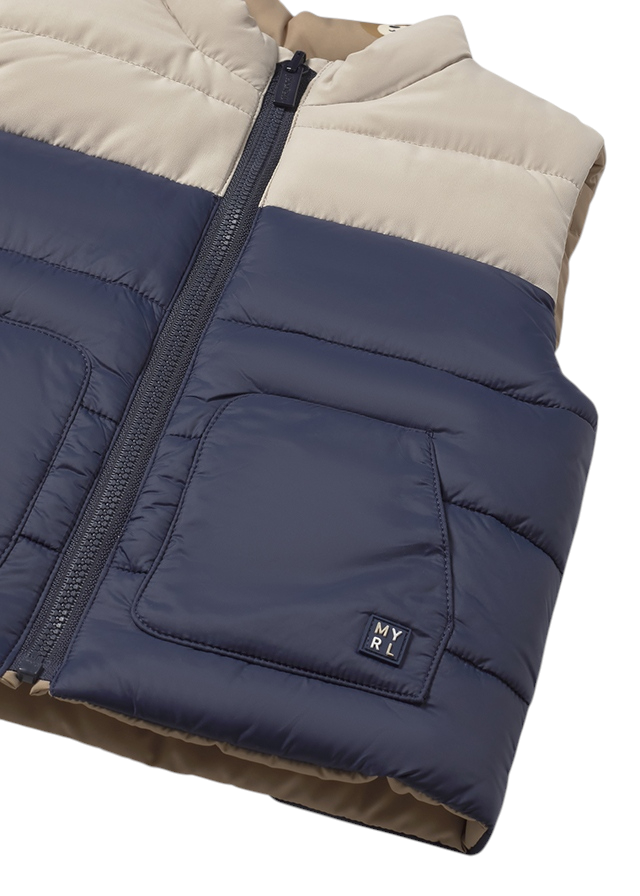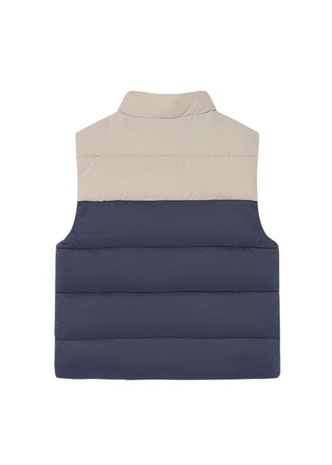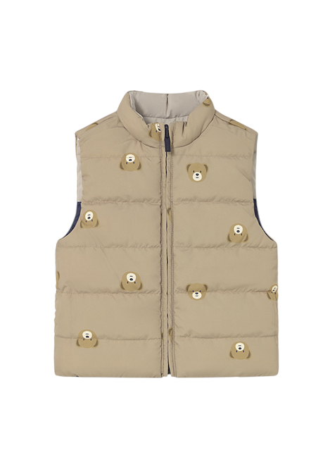 Relleno de la prenda 100% poliéster reciclado. Chaleco para bebé. Cierre central delantero con cremallera. Exterior textil con efecto acolchado. Suave forro interior de poliéster. Este modelo presenta un diseño reversible.