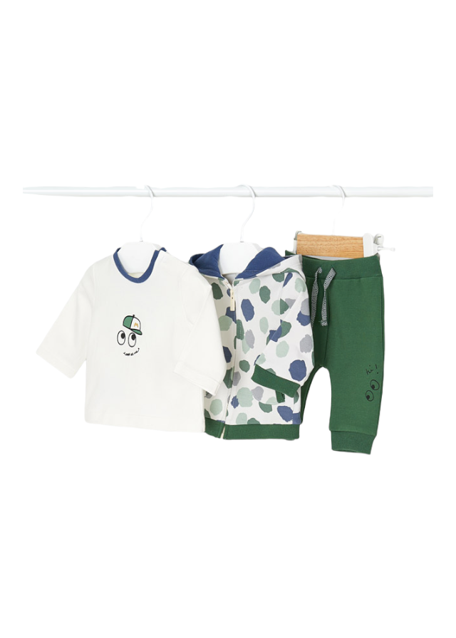 Conjunto de tres piezas para recién nacido compuesto por una sudadera, un pantalón largo deportivo y una camiseta a juego.