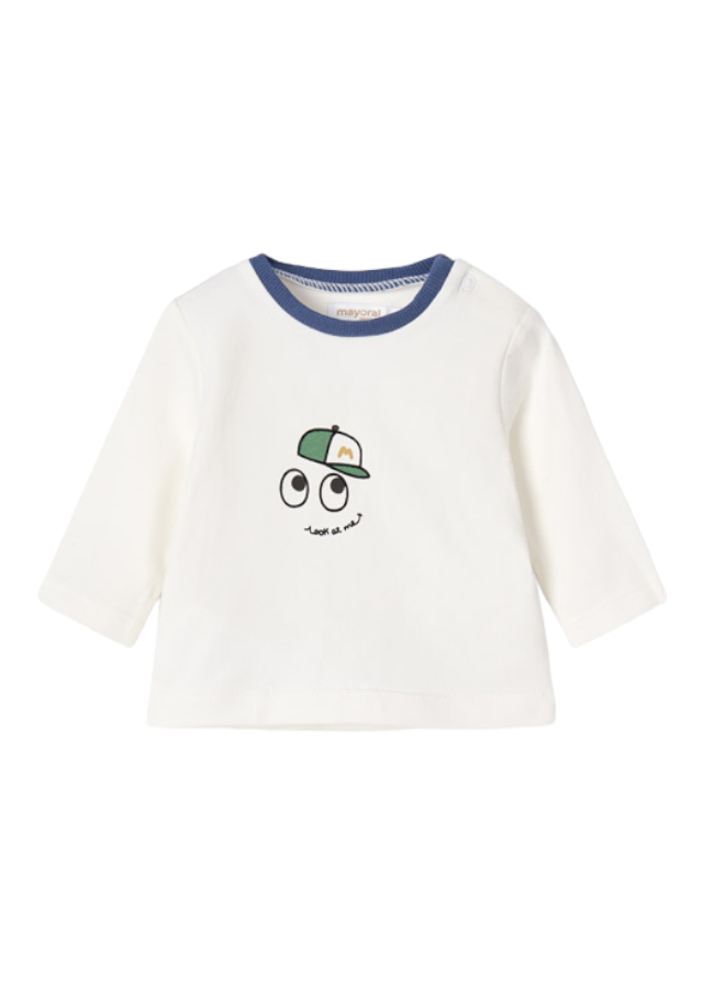 Camiseta de manga larga para recién nacido. Cierre con botones a presión en el hombro para facilitar la puesta de la prenda.