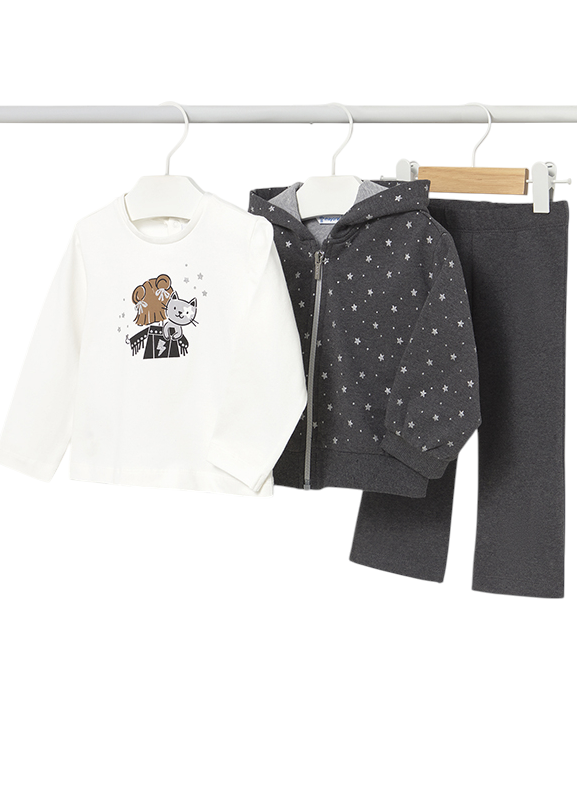 Chándal de tres piezas para bebé compuesto por una sudadera, un pantalón largo deportivo y una camiseta a juego.