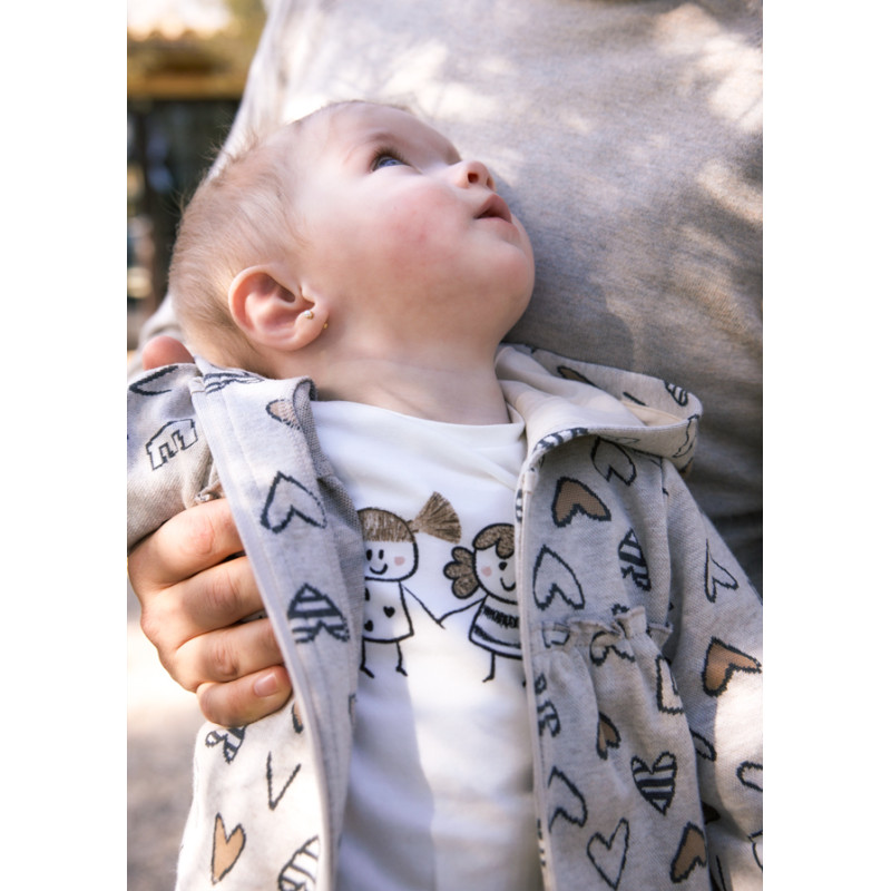 Canguro de manga larga para recién nacida. Cuello con capucha. Cierre central delantero con cremallera. Cálido tejido elegante y sofisticado para las ocasiones más especiales. Detalle de corazones.