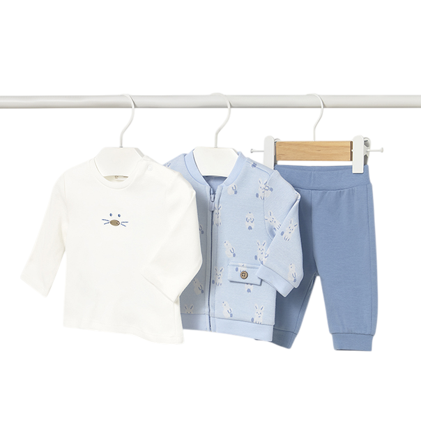 Chándal de tres piezas para recién nacido compuesto por una sudadera, un pantalón largo deportivo y una camiseta a juego.