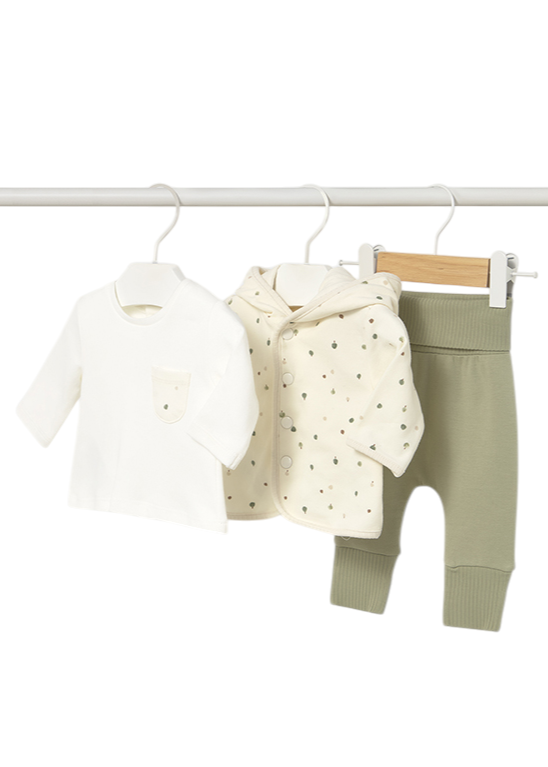 Chándal de tres piezas para recién nacido compuesto por una sudadera, un pantalón largo deportivo y una camiseta a juego.