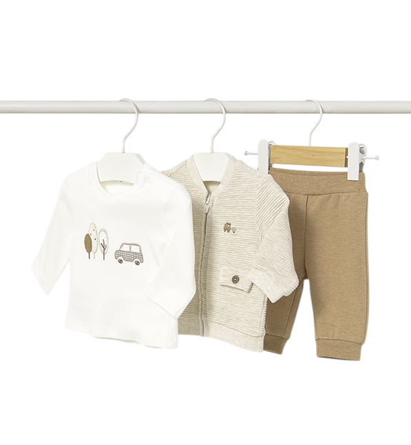 Chándal de tres piezas para recién nacido compuesto por una sudadera, un pantalón largo deportivo y una camiseta a juego.