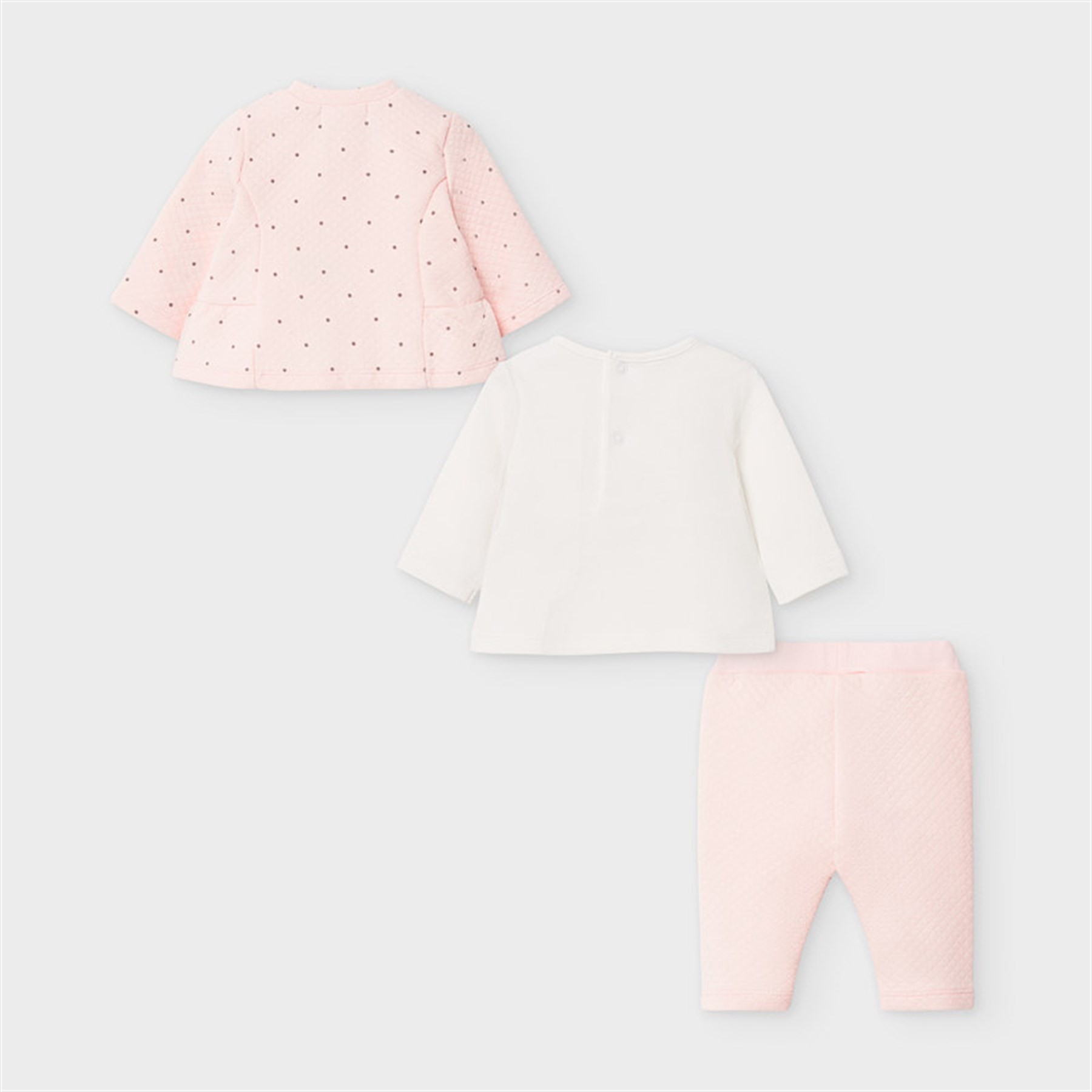 Chándal Mayoral de tres piezas para niña bebé compuesto por una sudadera con cremallera, un pantalón largo deportivo y una camiseta a juego.