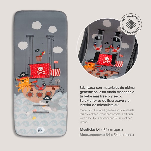 Haz que los paseos de verano sean más divertidos y frescos con la colchoneta universal de verano INTERBABY modelo Pirata Caribe. Un diseño original con simpáticos motivos de piratas, ideal para bebés aventureros que necesitan confort sin renunciar al estilo.