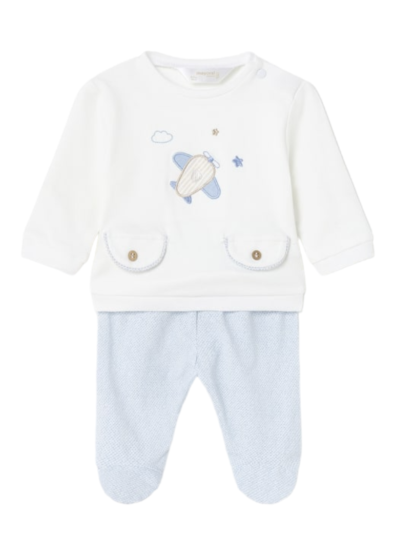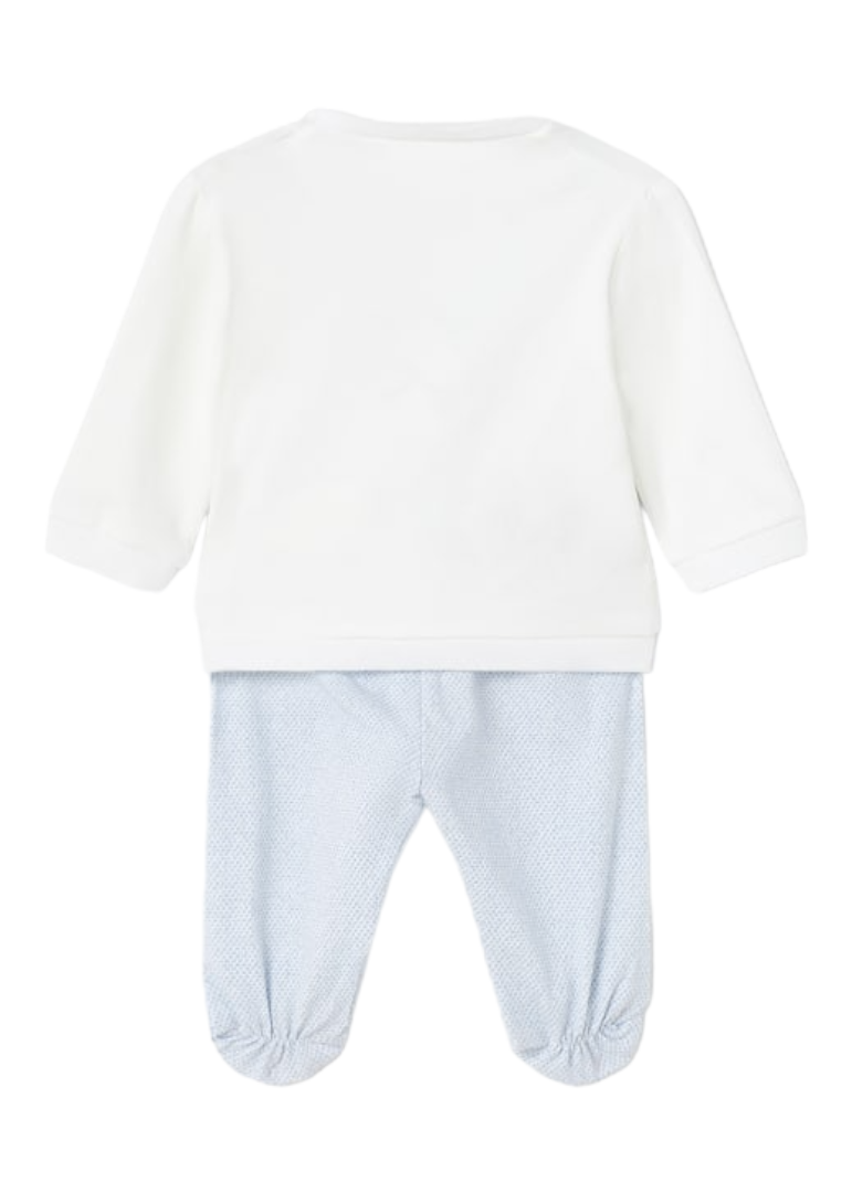 Este conjunto tricot de dos piezas para recién nacido incluye un jersey con polaina a juego.