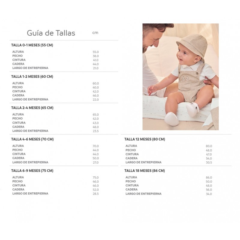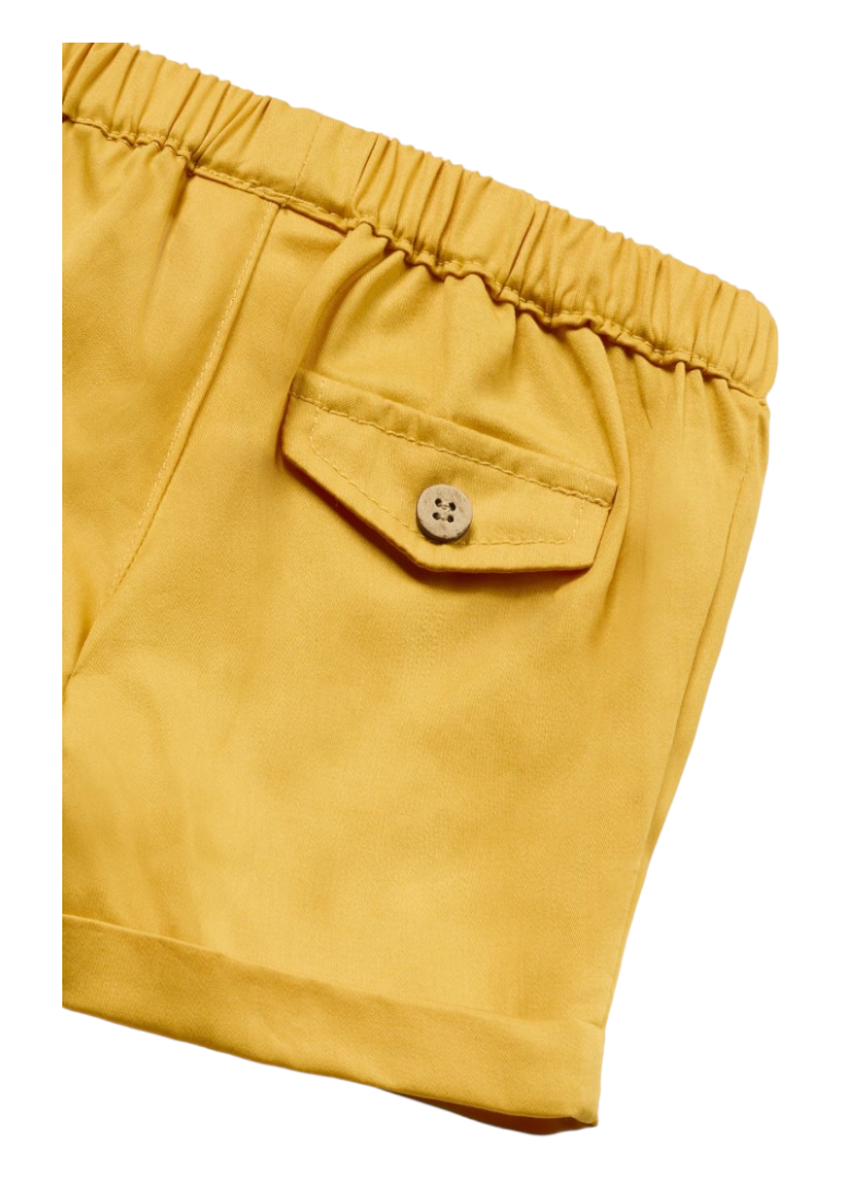 Pantalón de tipo bermuda para recién nacido. Goma elástica en la cintura para un mejor ajuste. Tejido 100% algodón. Detalle de bajo con vuelta. Bolsillo simulado decorativo en la parte trasera. Diseño liso.