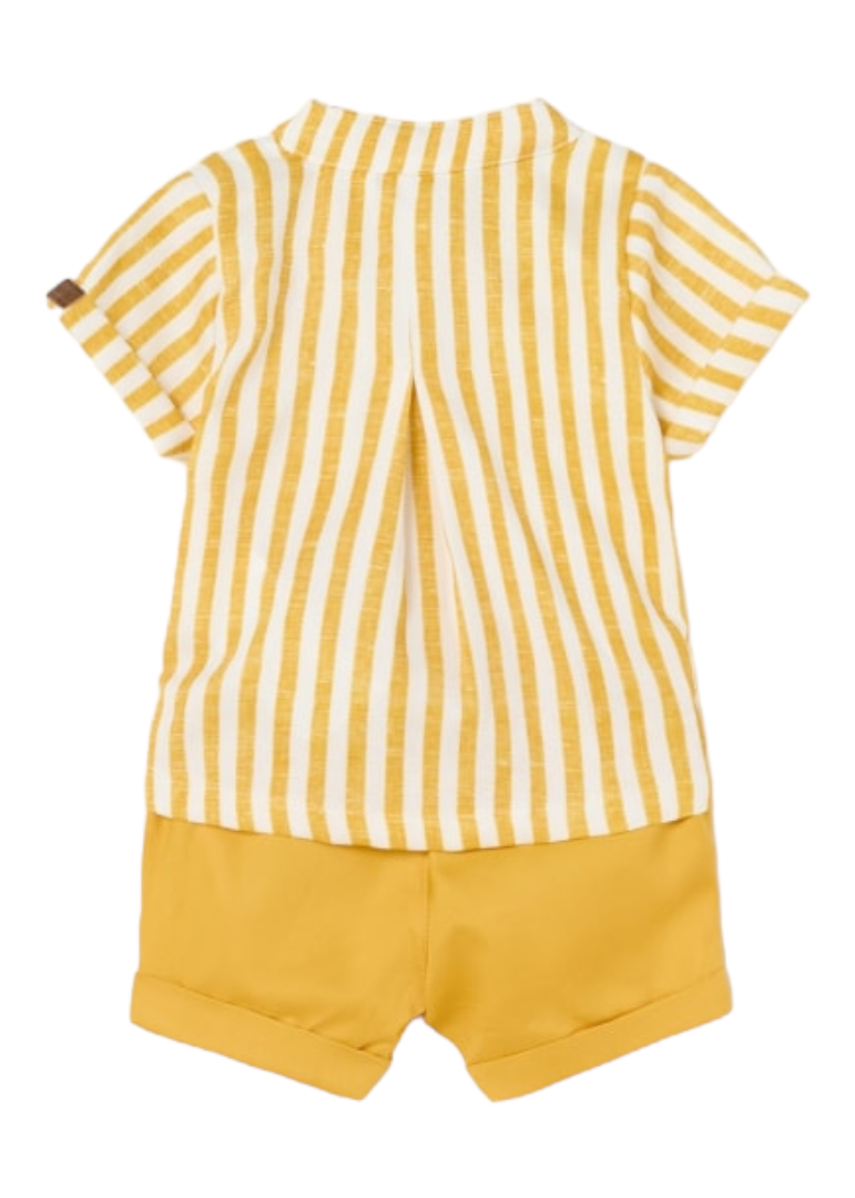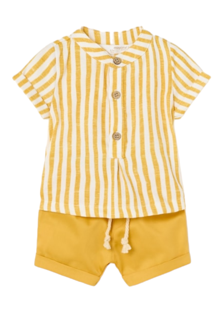 Camisa de manga corta para recién nacido. Modelo con cuello mao al tono. Cierre con botones en la parte delantera. Tejido 100% algodón. Motivo de rayas.