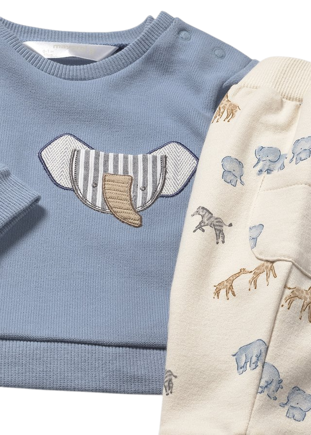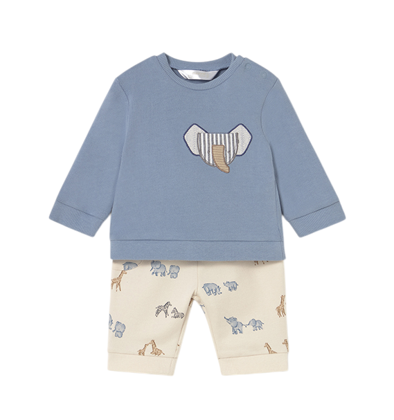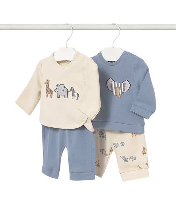 Set de cuatro piezas para recién nacido formado por dos conjuntos de sudadera y pantalón largo combinables.