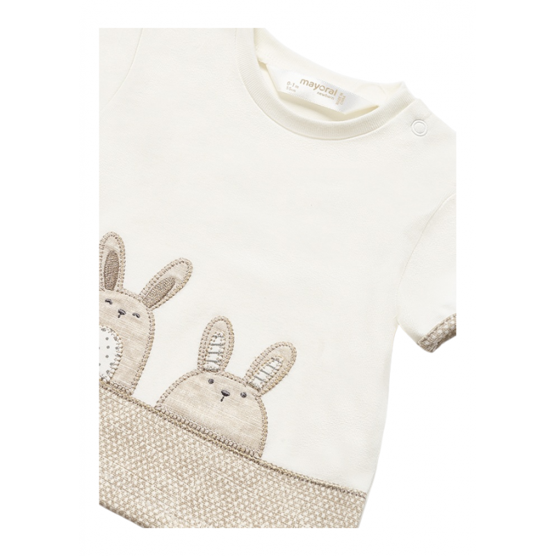 Camiseta de manga corta para recién nacido. Cierre con botones en el hombro. Diseño con delicados motivos infantiles.
