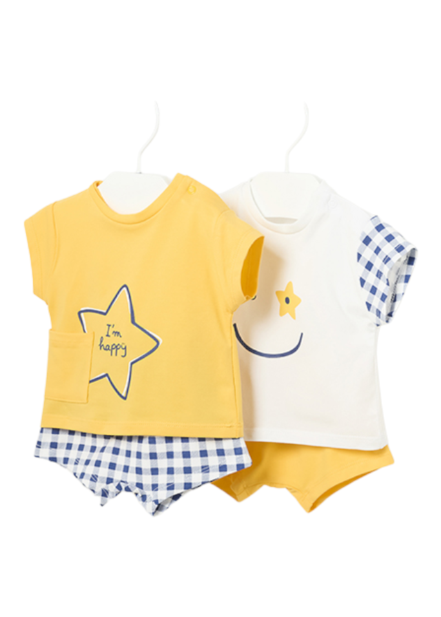 Set de cuatro piezas para recién nacido formado por dos conjunto de camiseta de manga corta y short combinables.