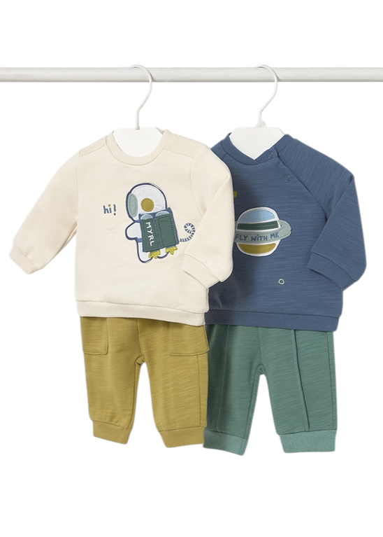 Set de cuatro piezas para recién nacido formado por dos conjuntos de sudadera y pantalón largo combinables.