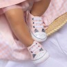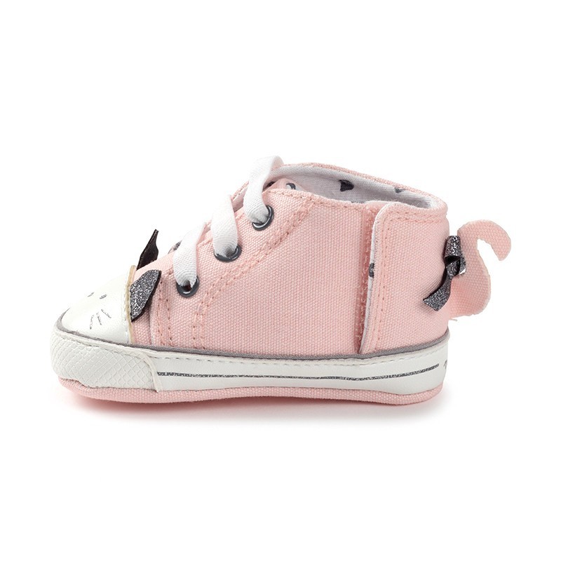 Modernos botines deportivos para recién nacida , ideales para dar un toque casual a su look. Cierre con cordones elásticos que permiten un mejor ajuste y facilitan el calce. Elementos de adorno: aplique de orejitas.