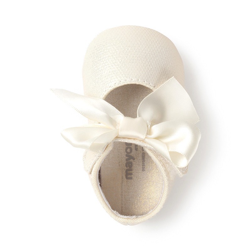 Zapatos de tipo merceditas para recién nacida niña, de estilo clásico y atemporal para sus estilismos más elegantes. Calzado con forro interior y plantilla de algodón transpirable. Cierre con banda de velcro ajustable que garantiza una perfecta sujeción del pie. Elementos de adorno: aplique de lazo.
