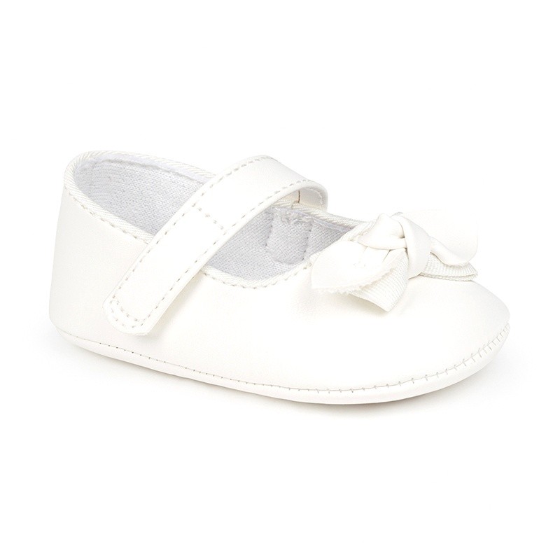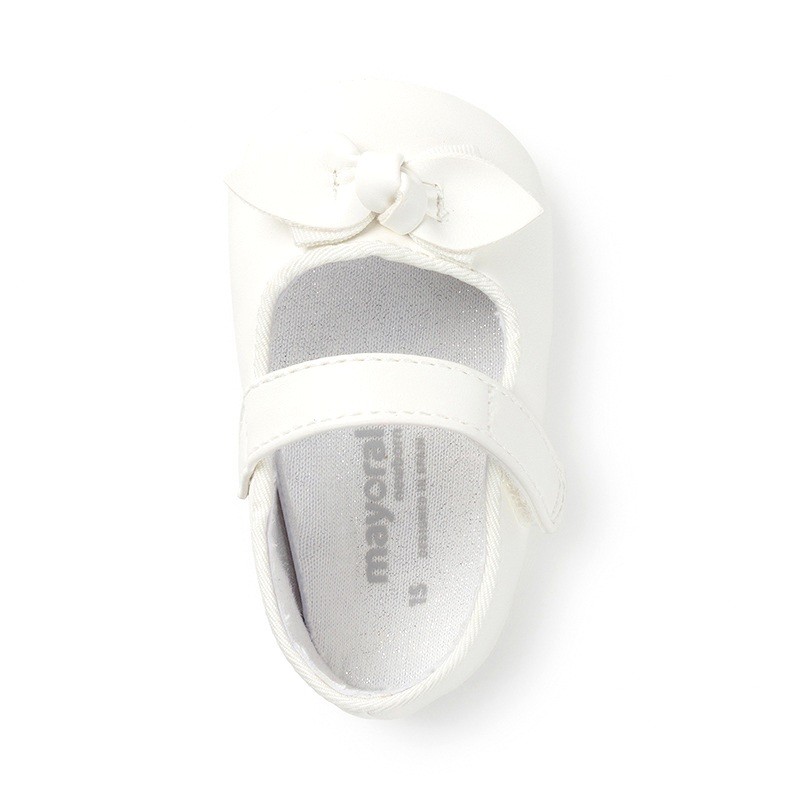 Zapatos de tipo merceditas para recién nacida niña, de estilo clásico y atemporal para sus estilismos más elegantes. Calzado con forro interior y plantilla de algodón transpirable. Cierre con banda de velcro ajustable que garantiza una perfecta sujeción del pie. Elementos de adorno: aplique de lazo.