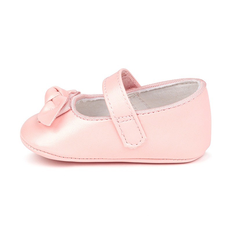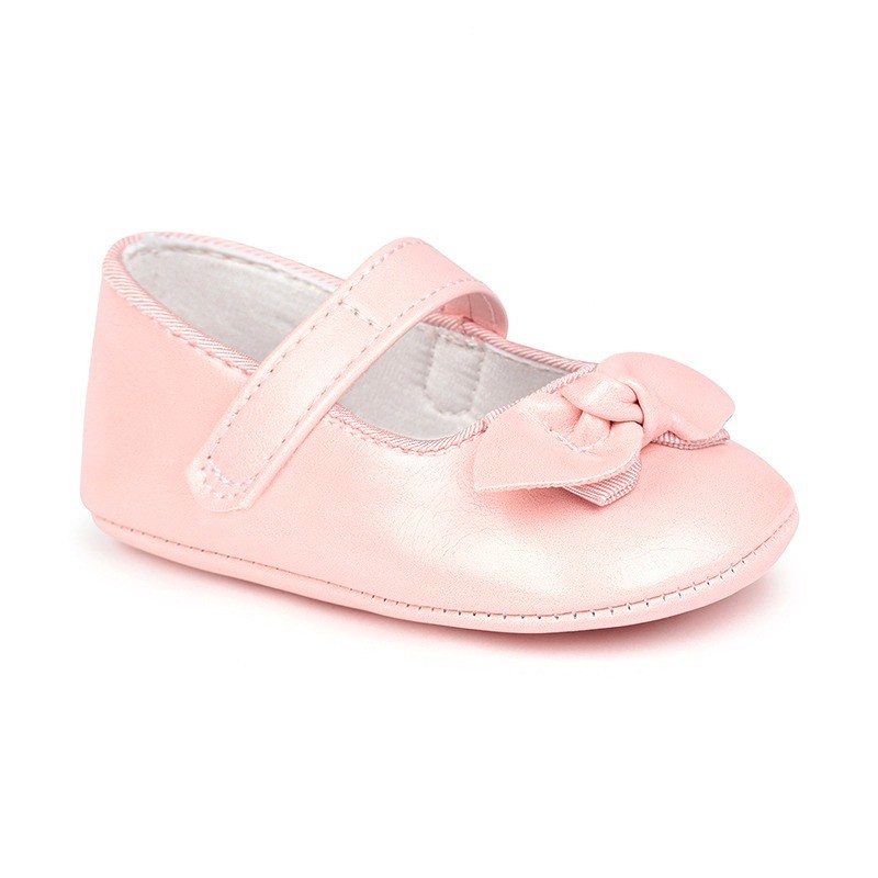 Zapatos de tipo merceditas para recién nacida niña, de estilo clásico y atemporal para sus estilismos más elegantes. Calzado con forro interior y plantilla de algodón transpirable. Cierre con banda de velcro ajustable que garantiza una perfecta sujeción del pie. Elementos de adorno: aplique de lazo.