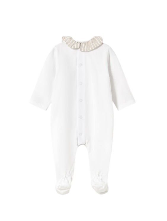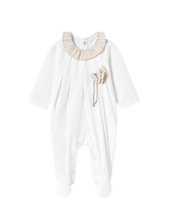 Pijama de manga larga para recién nacido. Diseño con pies. Cuello redondo con volante.