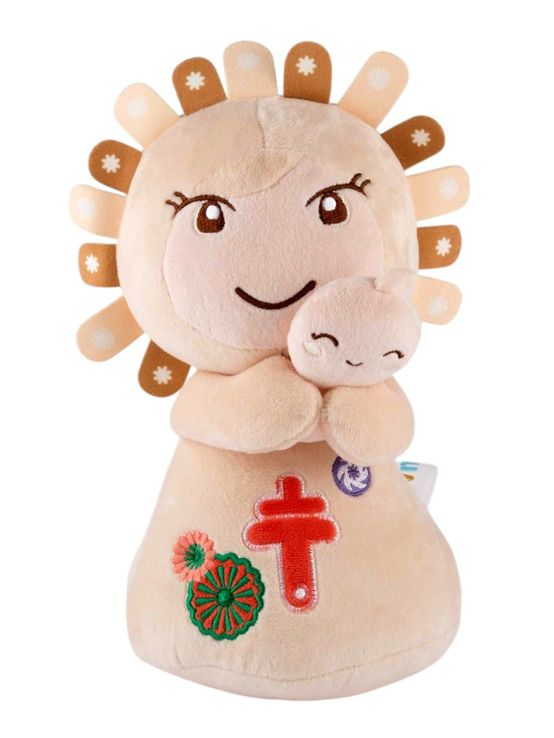 Peluche apto para recién nacidos. El Niño está cosido al manto y las flores están bordadas tanto en la parte frontal como en la posterior. Tacto suave y agradable.
