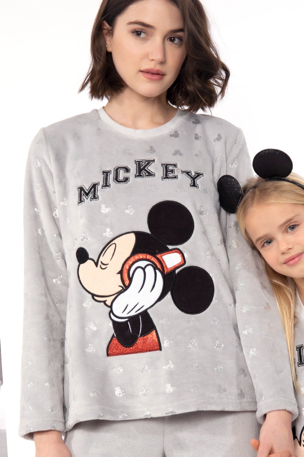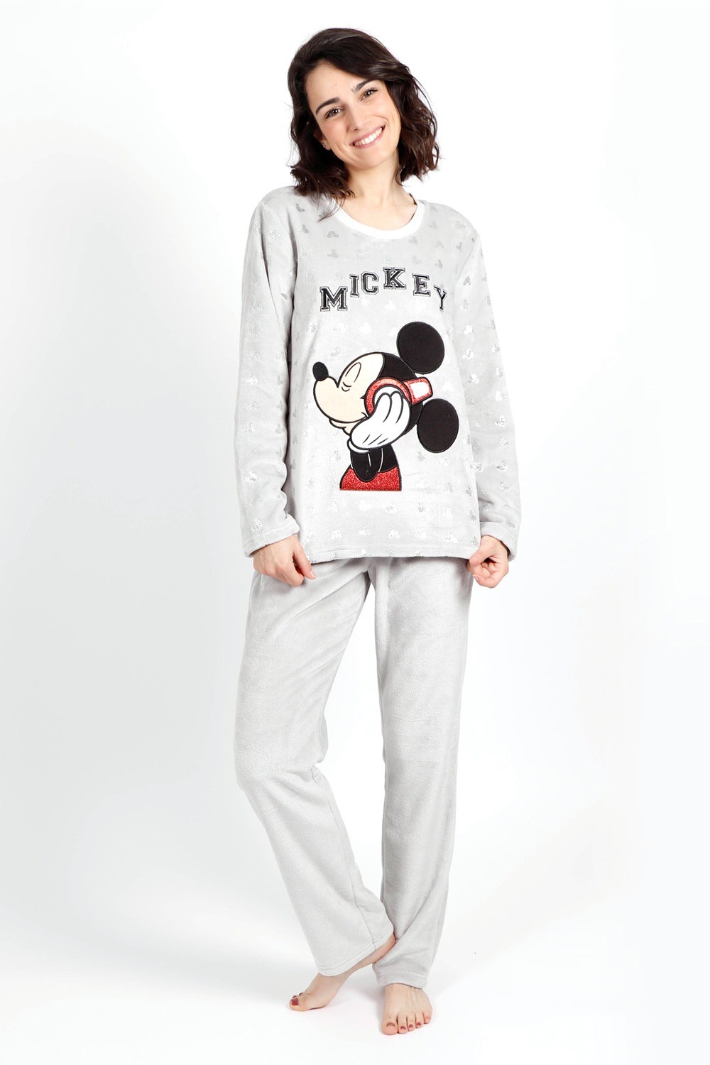 Pijama divertido y original para Señora en tono Gris, camiseta con aplique Bordado de Mickey Mouse