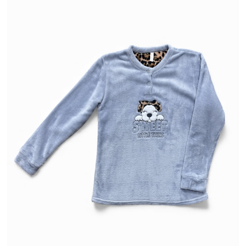 Pijama Mujer Coralina con Pantalón Animal Print y Camiseta Lisa con Aplique Bordado Descubre la combinación perfecta de estilo y comodidad con este pijama de mujer confeccionado en coralina suave y muy calentita.