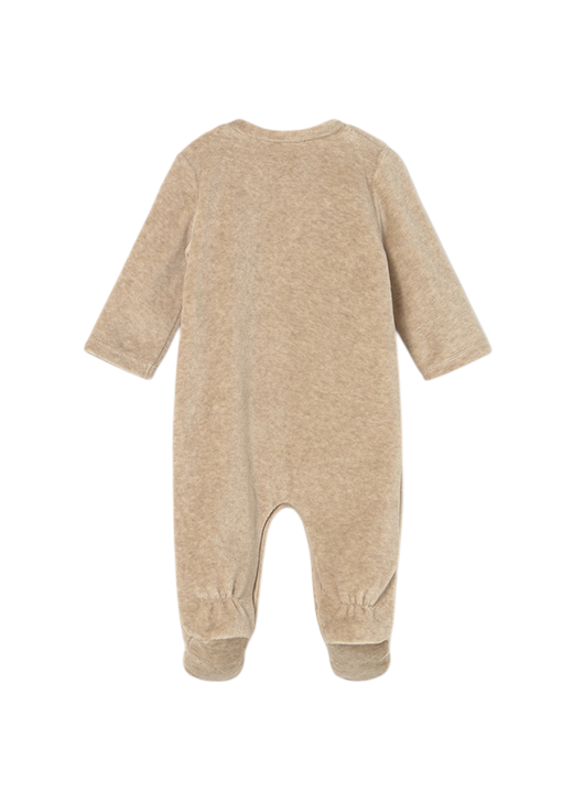 Pijama de manga larga para recién nacido. Cuello redondo. Cierre con botones a presión en la parte delantera. Botones a presión en la entrepierna para facilitar la puesta de la prenda. Cálido tejido de algodón con tacto suave y aterciopelado. Elementos de adorno: bordados. Las tallas mayores de este modelo (12 y 18 meses) presentan una suela antideslizante.