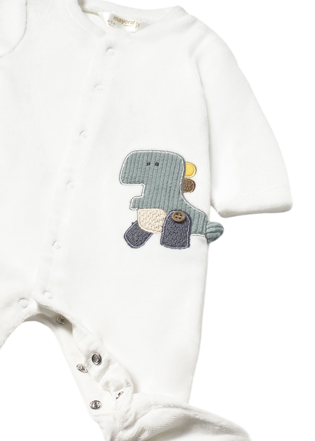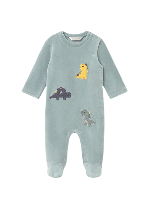 Pijama de manga larga para recién nacido. Cuello redondo. Cierre con botones a presión en la parte delantera. Botones a presión en la entrepierna para facilitar la puesta de la prenda. Cálido tejido de algodón con tacto suave y aterciopelado. Elementos de adorno: bordados. Las tallas mayores de este modelo (12 y 18 meses) presentan una suela antideslizante.
