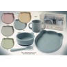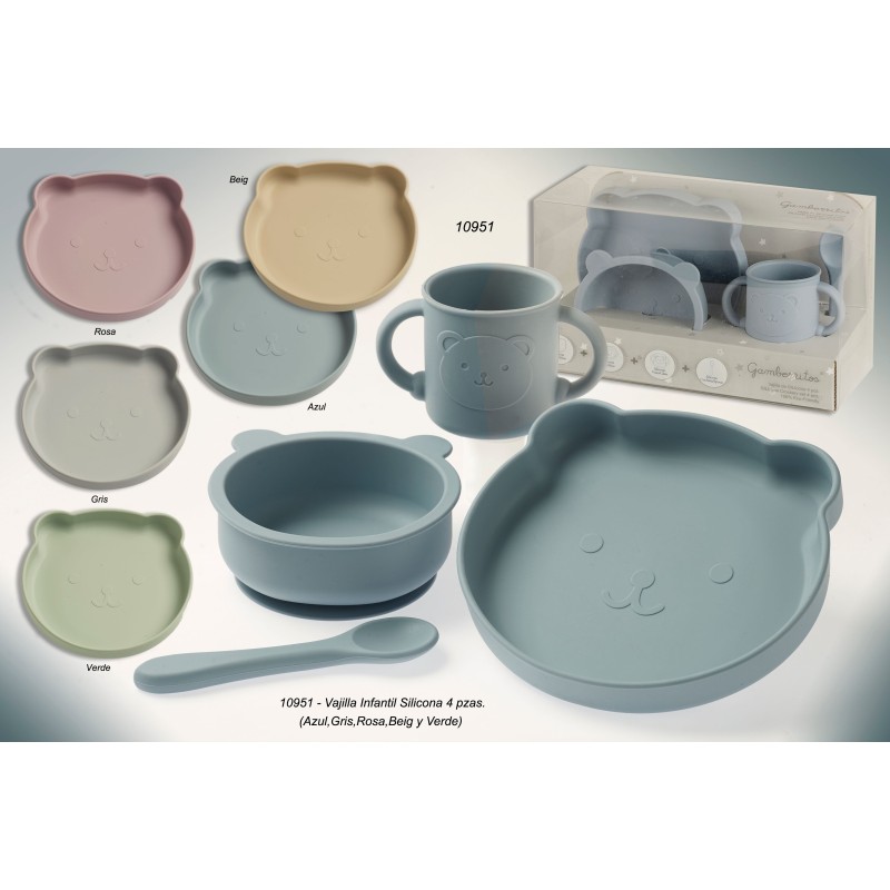 Vajilla de 4 piezas de silicona . Bol, Plato,  vaso y cuchara . Presentada en caja . Ideal para regalar.