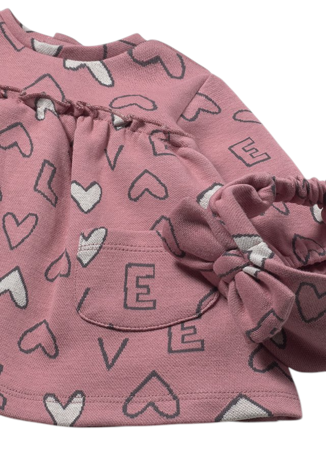 Vestido de manga larga para recién nacido. Cuello redondo. Cierre con botones a presión en la parte posterior. Modelo con rizo. Bolsillo lateral. Detalle de corazones.